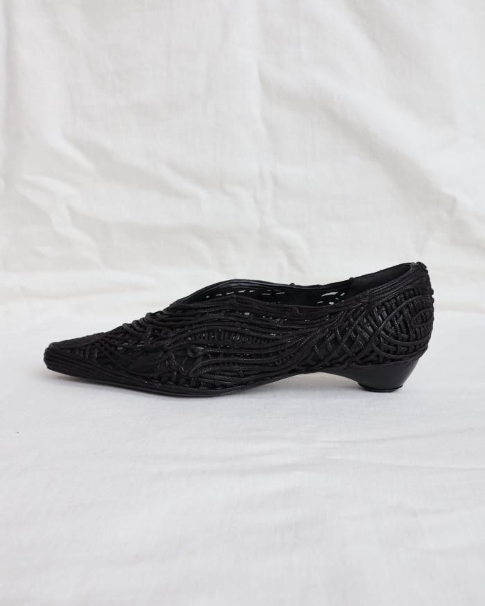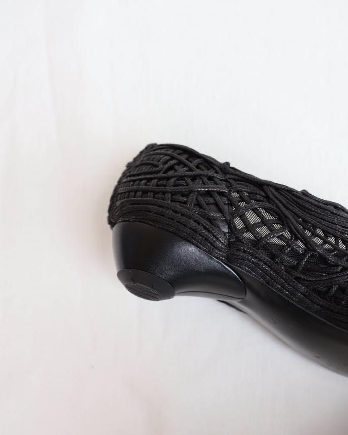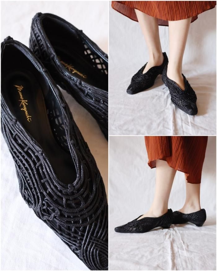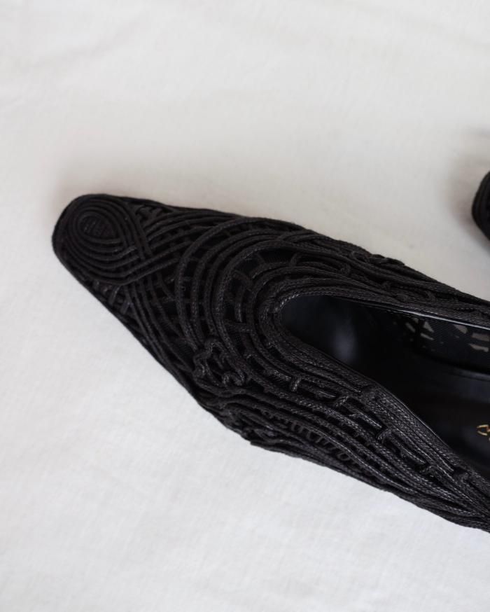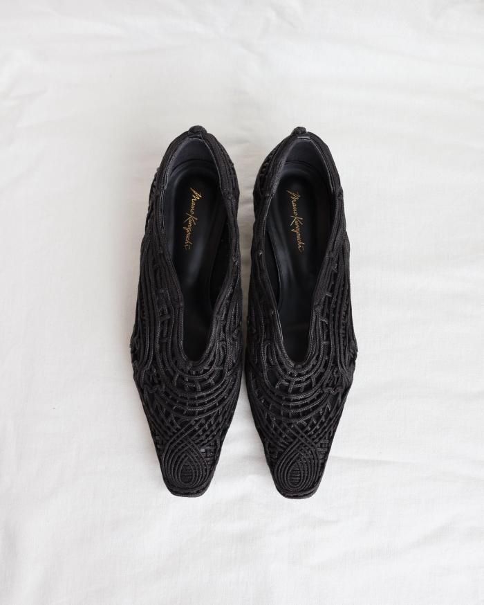マメならではの曲線が美しいパンプスの形で、コード刺繍バージョン。