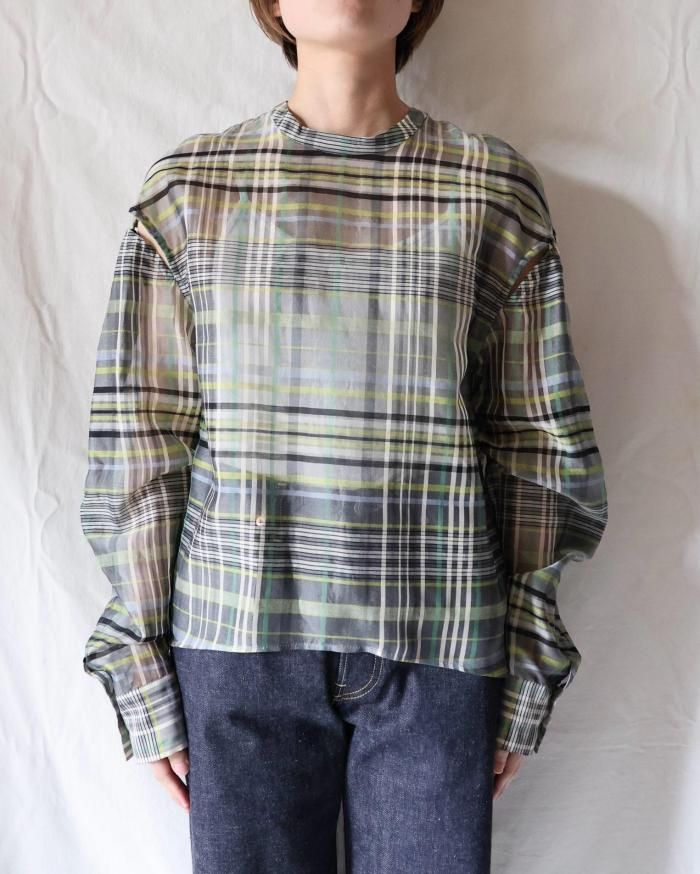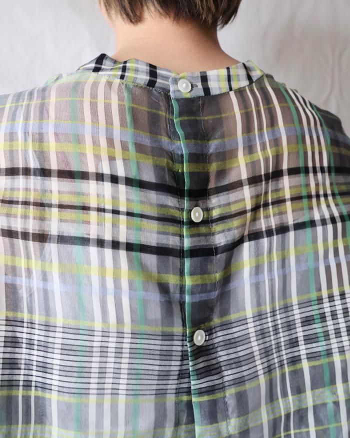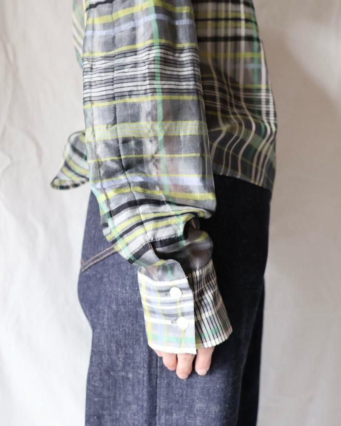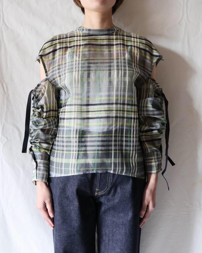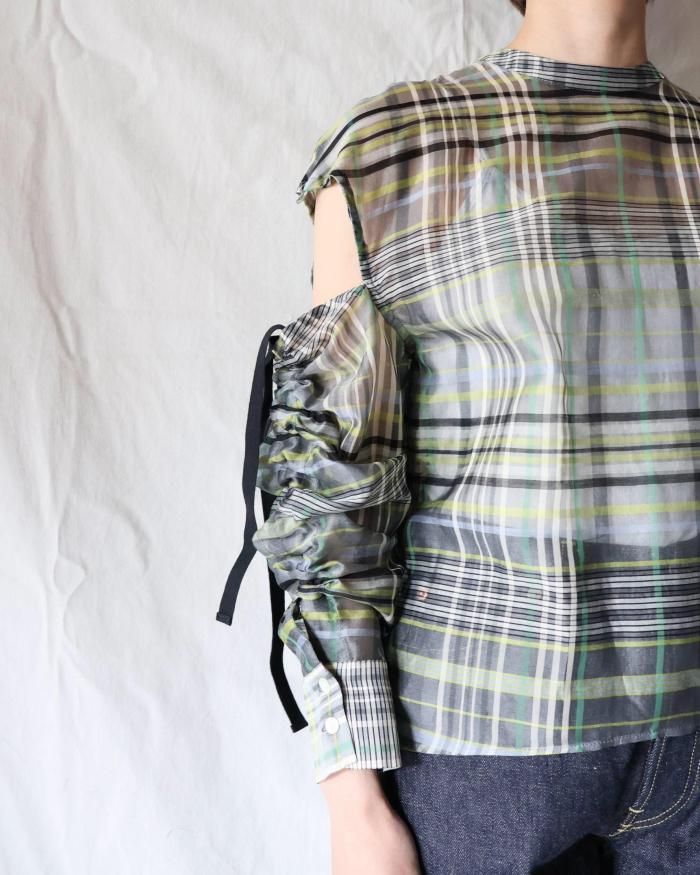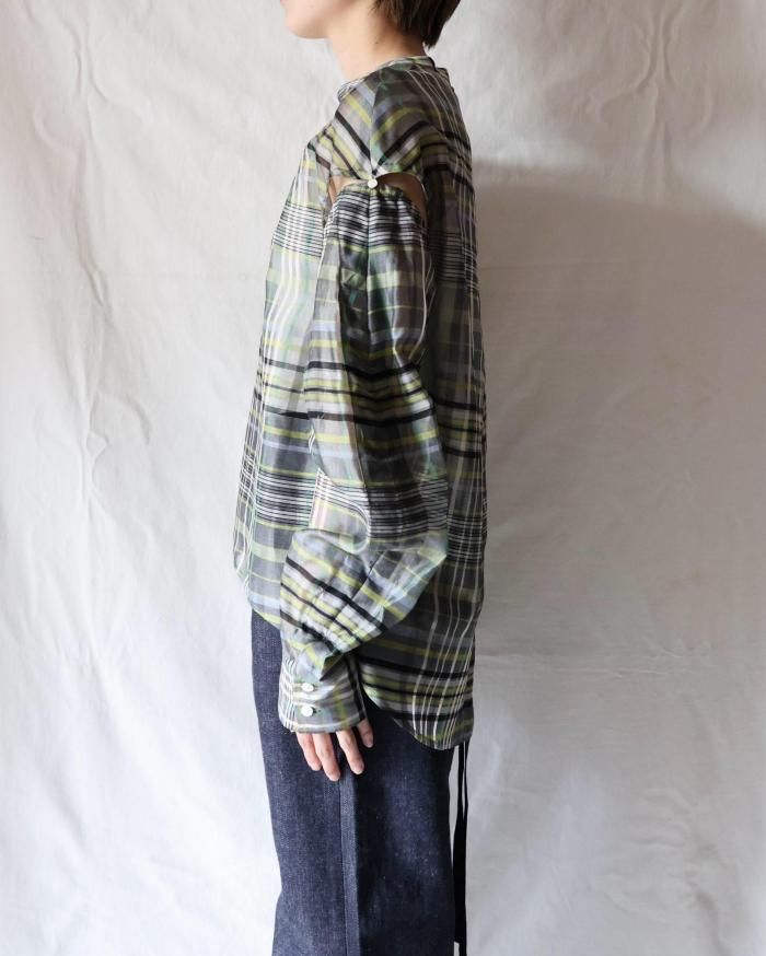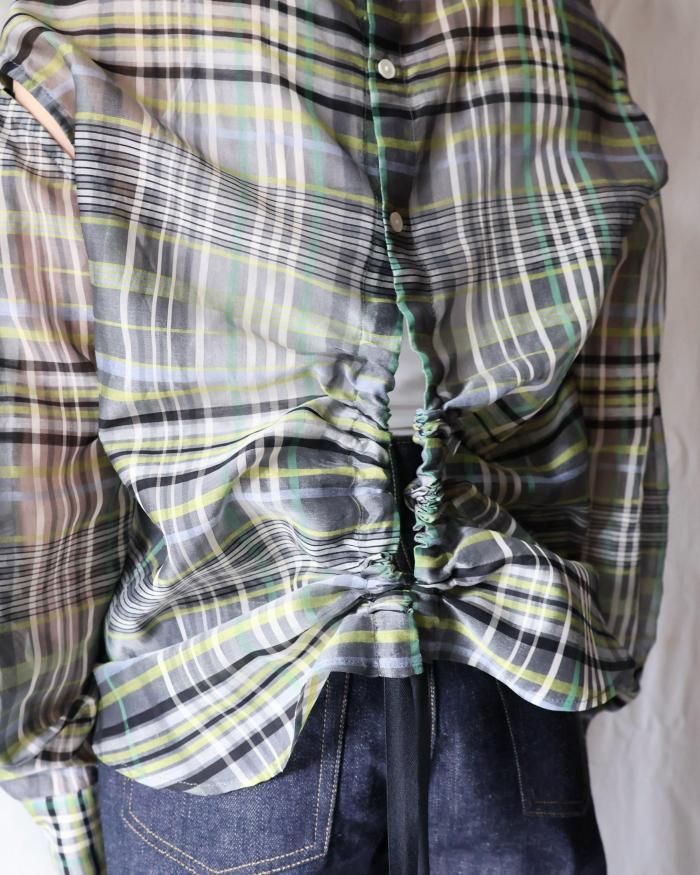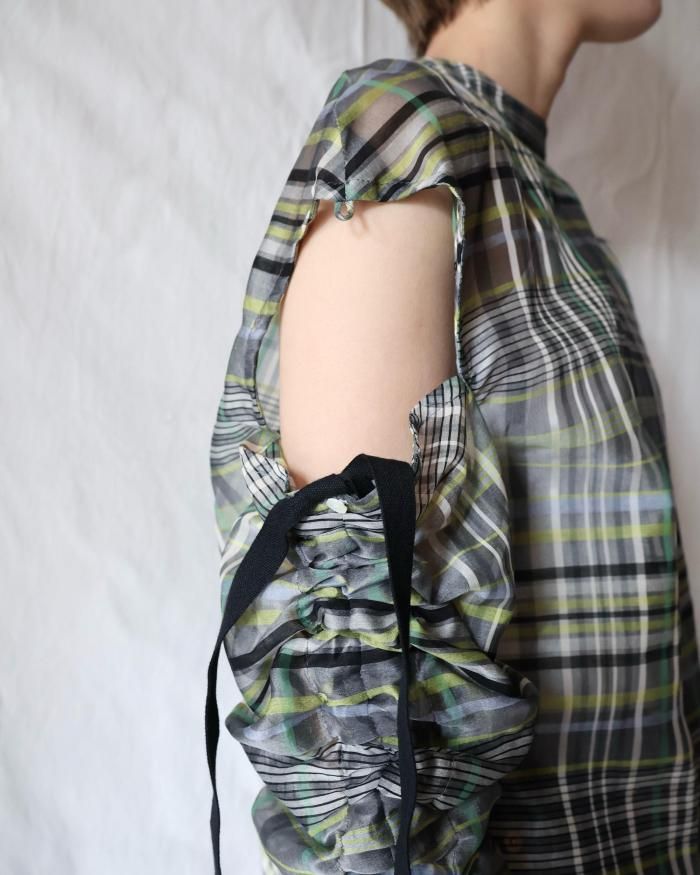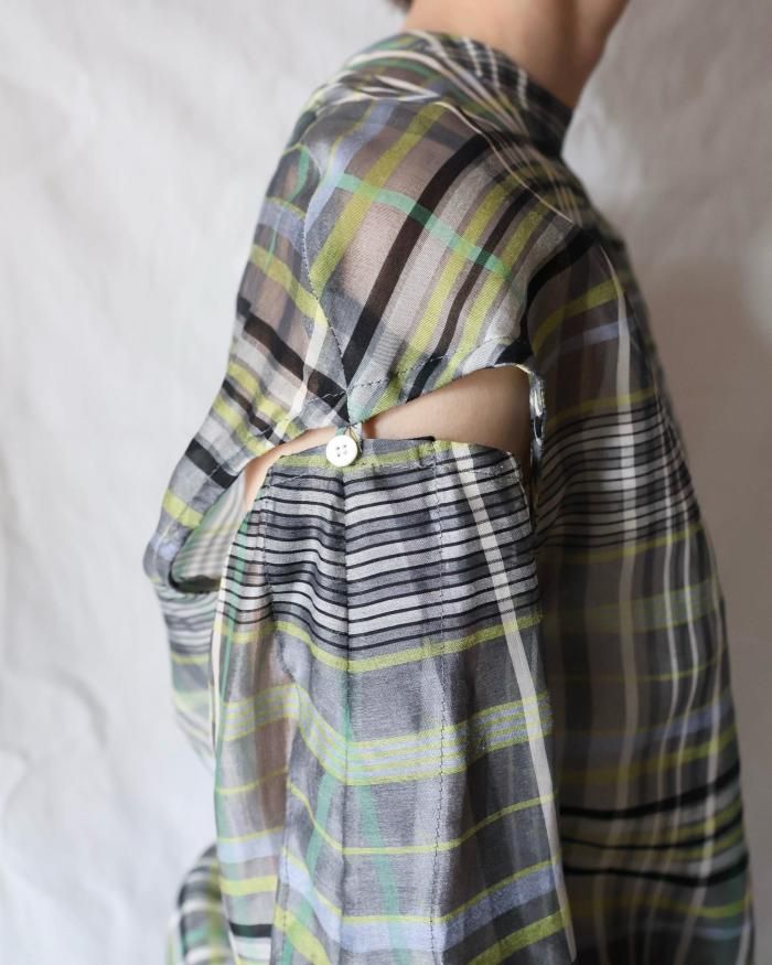 袖や後ろの紐を絞ったり、肩と袖を繋ぐボタンを外したり、前後反対に着用も。