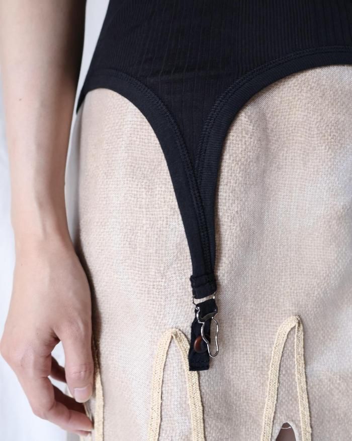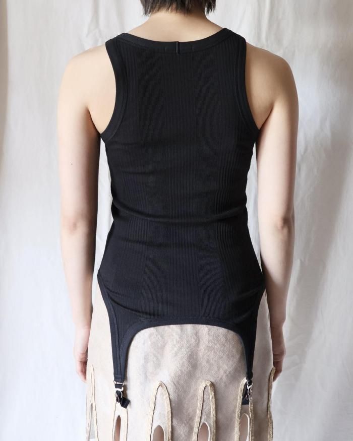 糸から作成し編み立てたオリジナル針抜きリブ素材のガーターパーツ付きタンクトップ。 裾はガーターベルトを意識したカーブのアウトライン。着用中や洗い込んだ際にも伸び 切ってしまわずにキックバックを保ちます。丸胴での3サイズ展開。