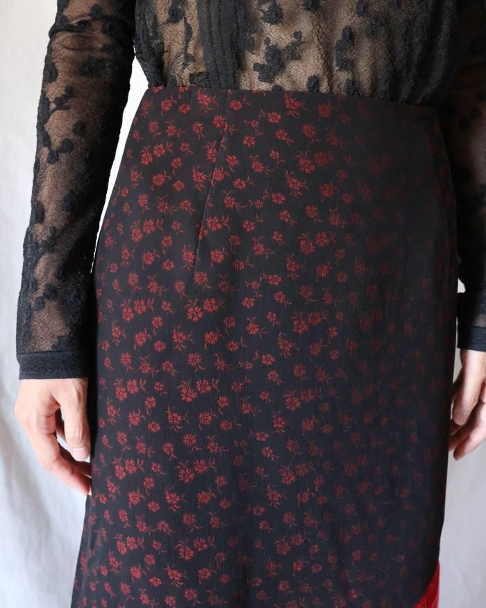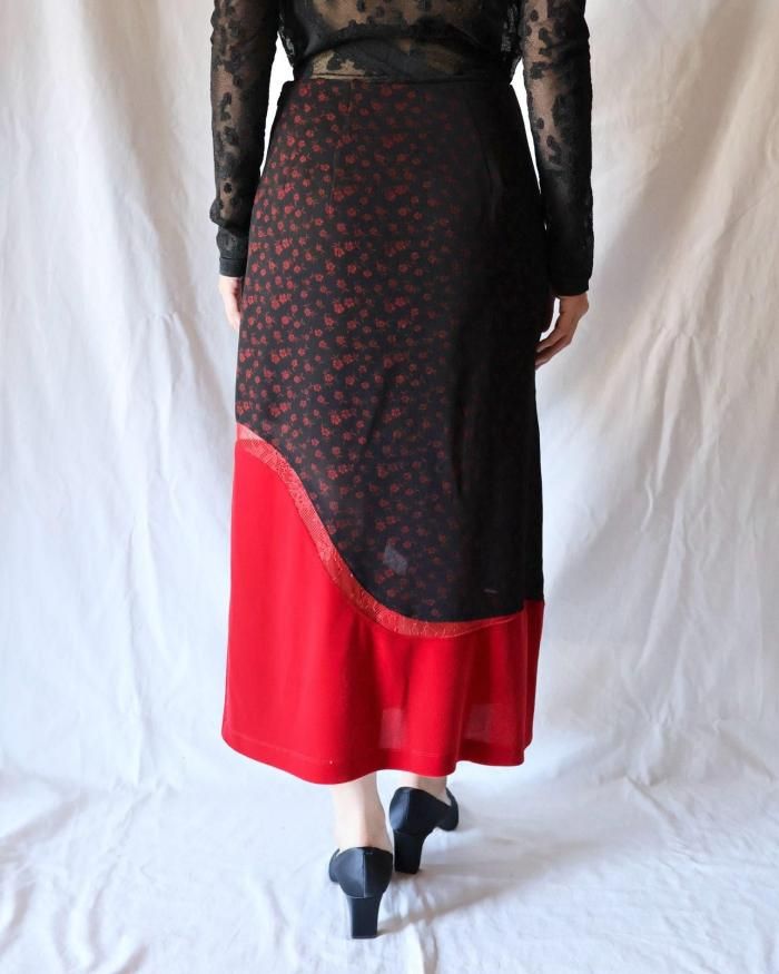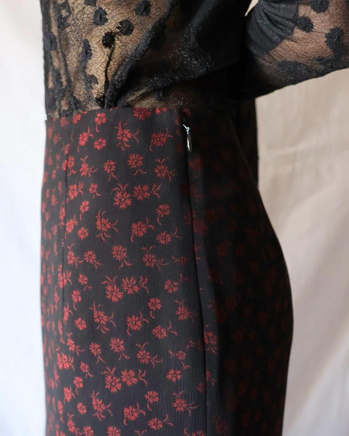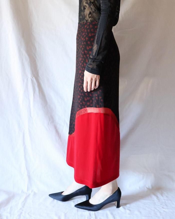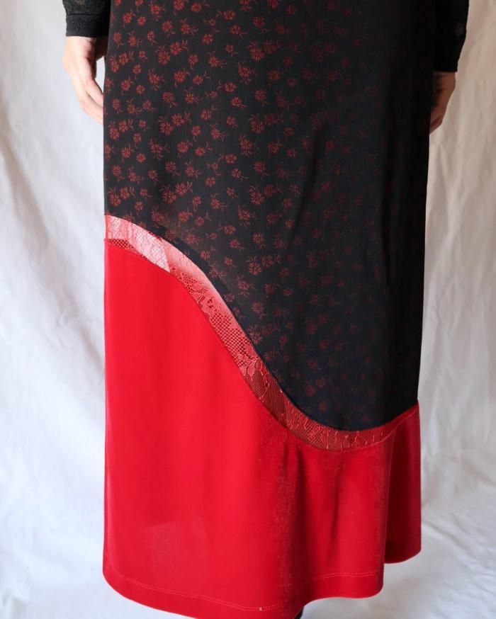 伸縮性のある薄いベロアとレース、花柄ジャカードが切り替えられたデザイン。