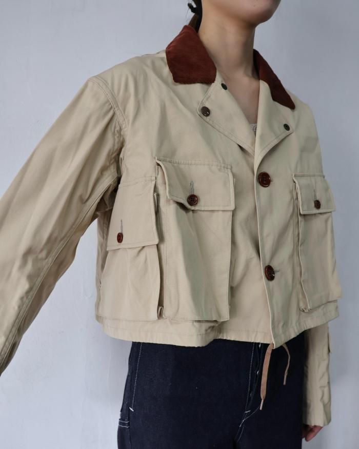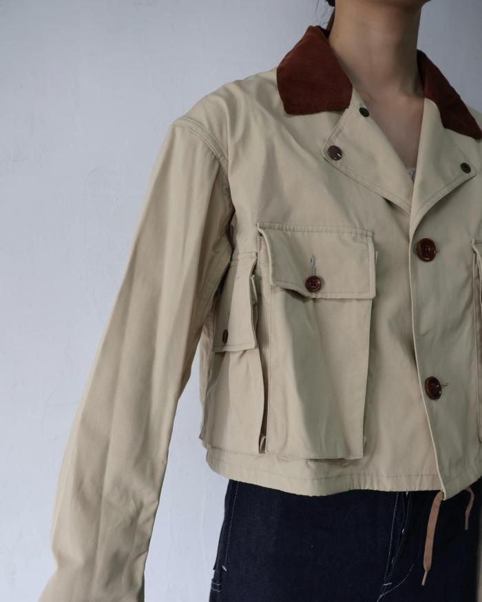 身頃、背中、袖先、ジャケット内側にポケット、フロントボタン開き。