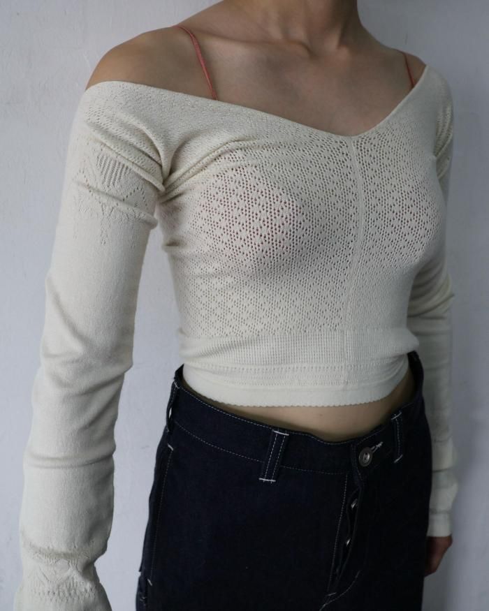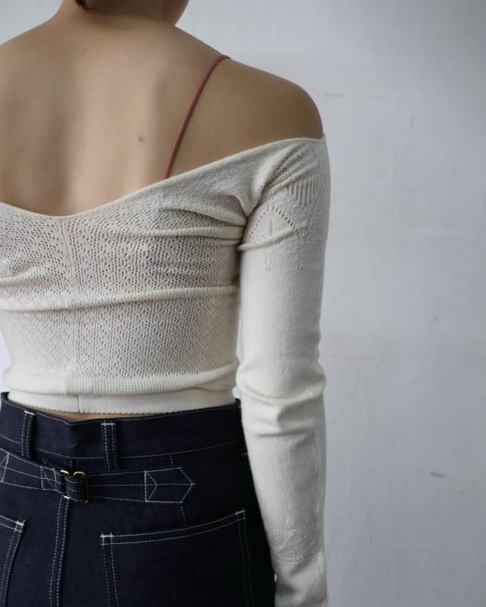 肩に掛けて深いVネックのようにも、オフショルダーでも着用できます。