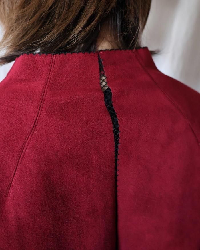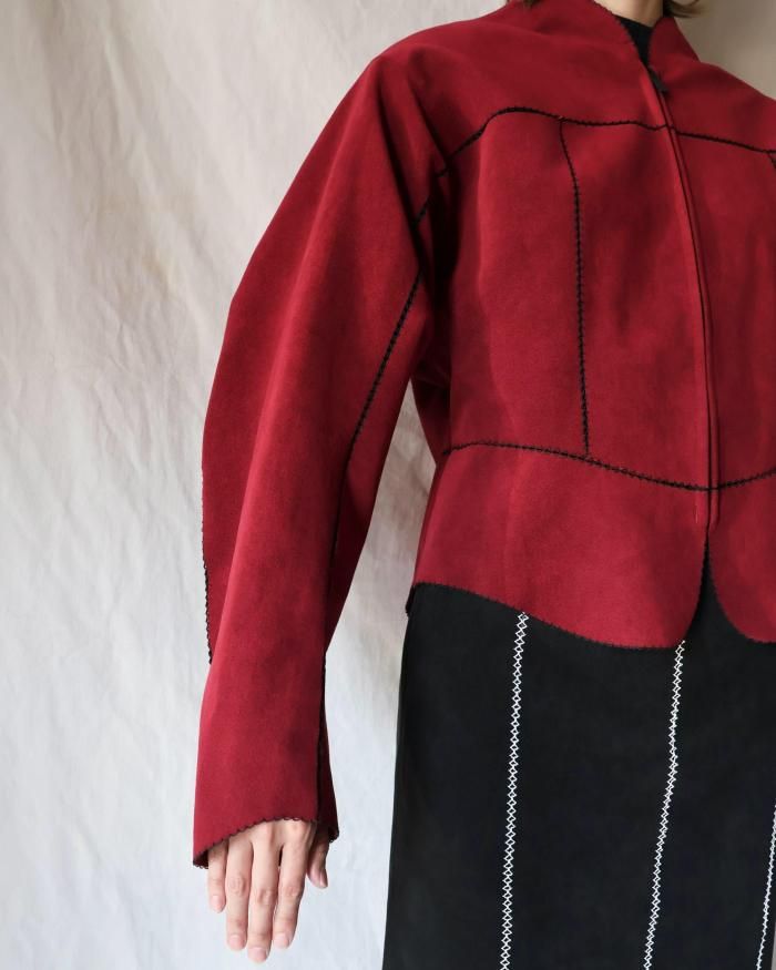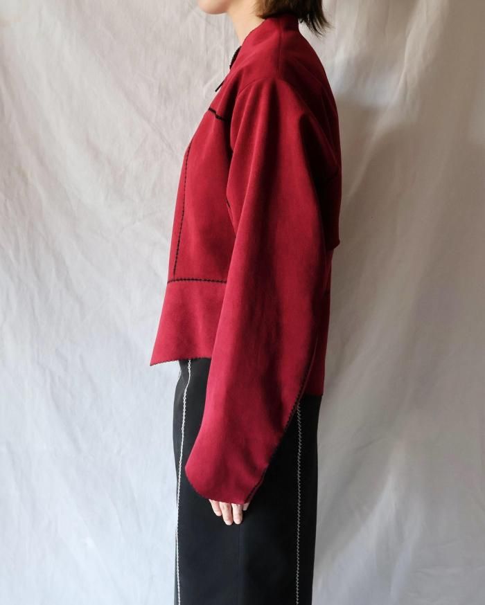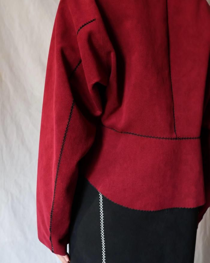 まるでスエードのような微光沢と起毛感のあるレザー調生地のショートジャケット。