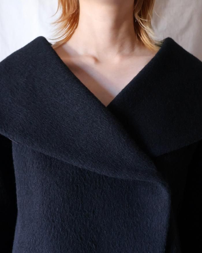 襟を立てるとマメならではの曲線とクールな印象がみえるコートに。