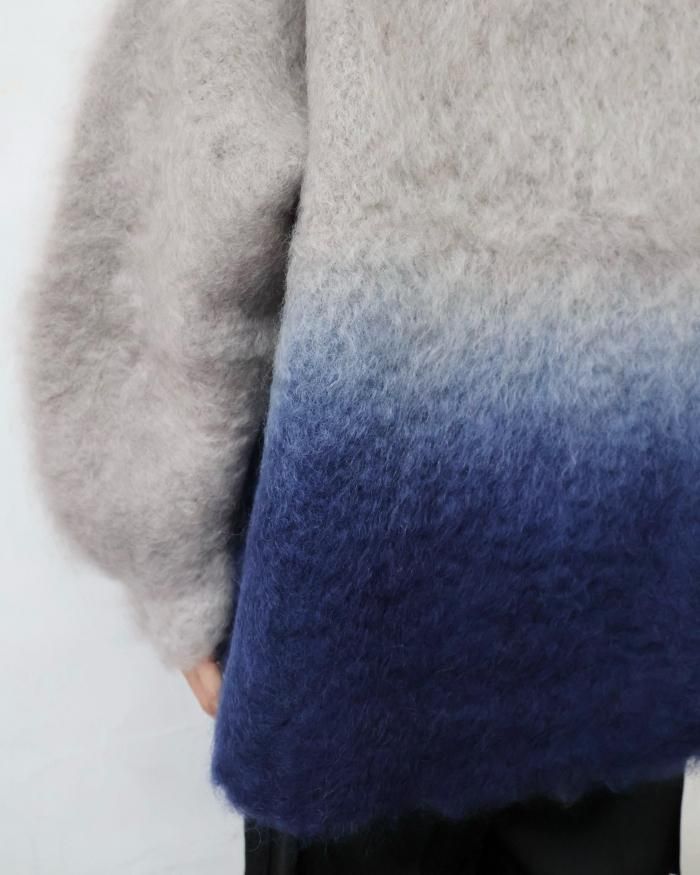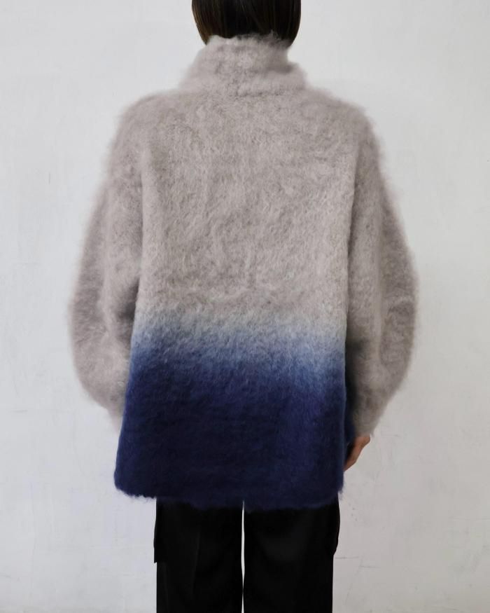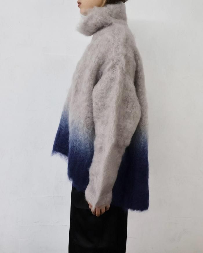 軽やかな印象な起毛ハイネックニットトップ。1点ずつ手作業で起毛加工を施すことで、軽やかで柔らかな質感。光沢感とハリのあるモヘア糸を使用し、丸みのある袖、コンパクトな身頃が、デザインにメリハリを与えてくれます。袖口に吊るし染めによる鮮やかな色彩をあしらうことで、シンプルながらも気品ある印象に。